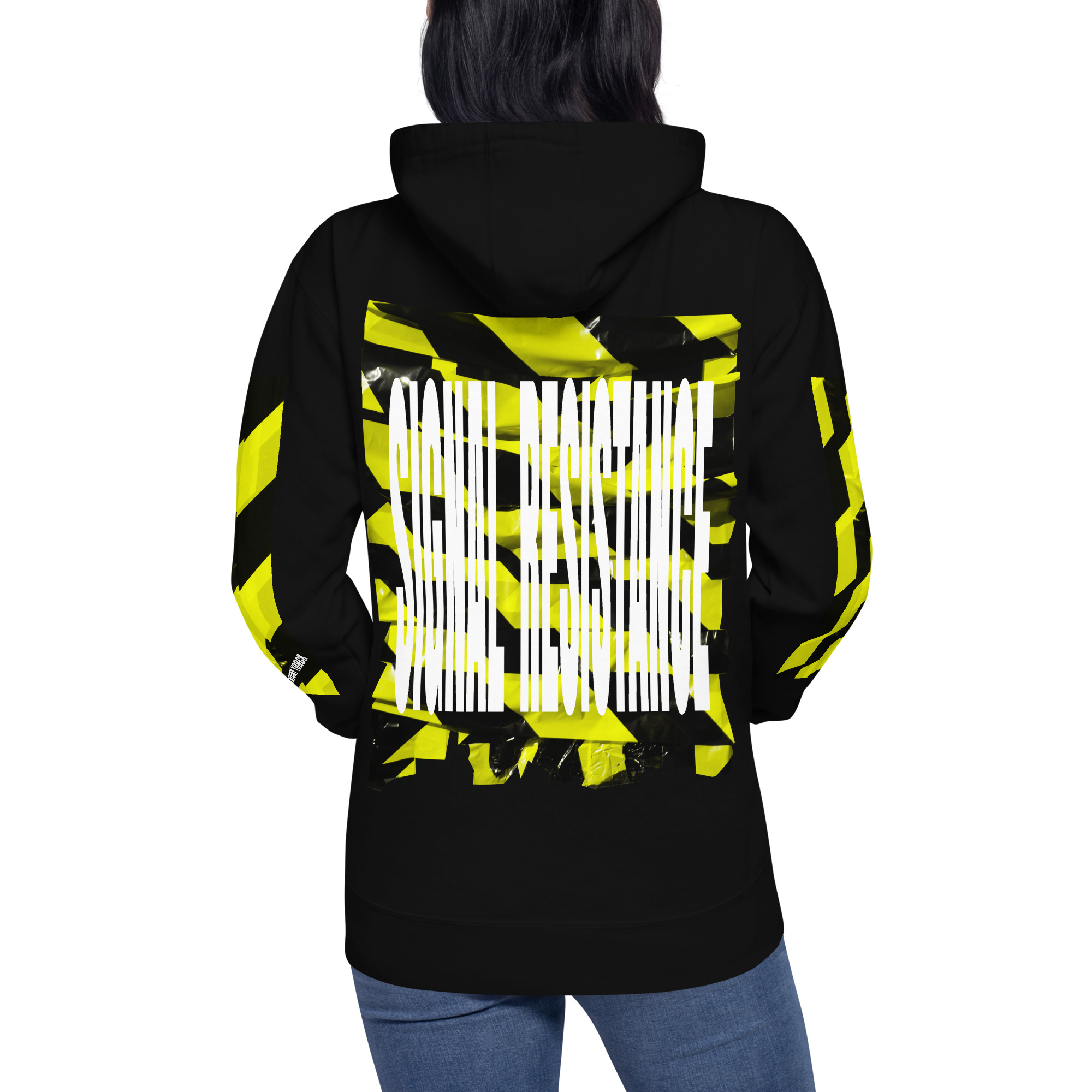 • Progressive Aesthetic: „Signal Resistance“ Typografie als zentrales Design-Element auf dem Rücken.